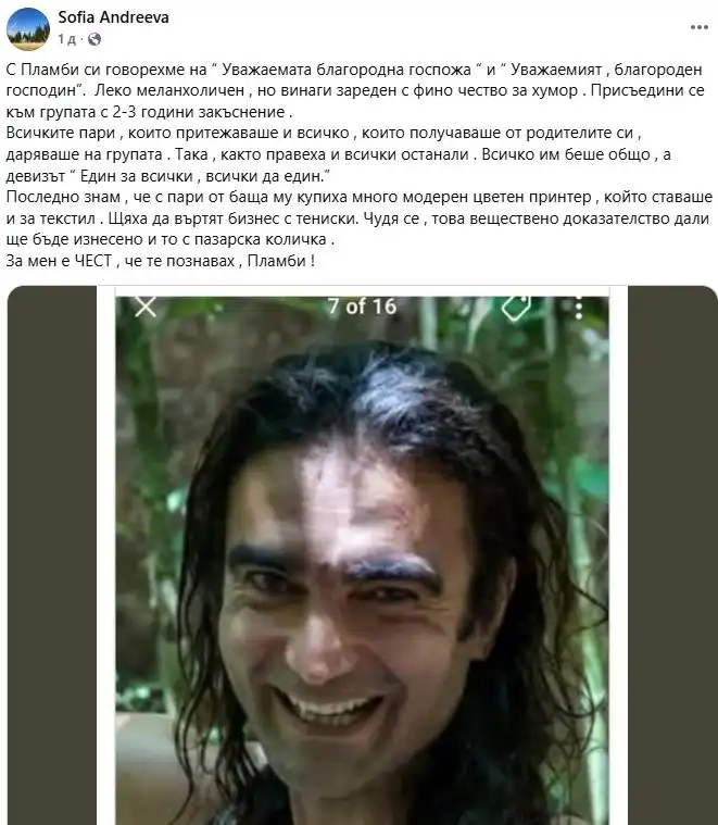 За mен е ЧЕСТ, че те познавах, Плаmби!”, написа Андреева.